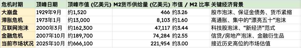 截至2025年10月,当前约 3.00 的比率已经超过了2007年金融危机前的水平,并正在接近历史上由股市驱动的泡沫峰值。这表明: